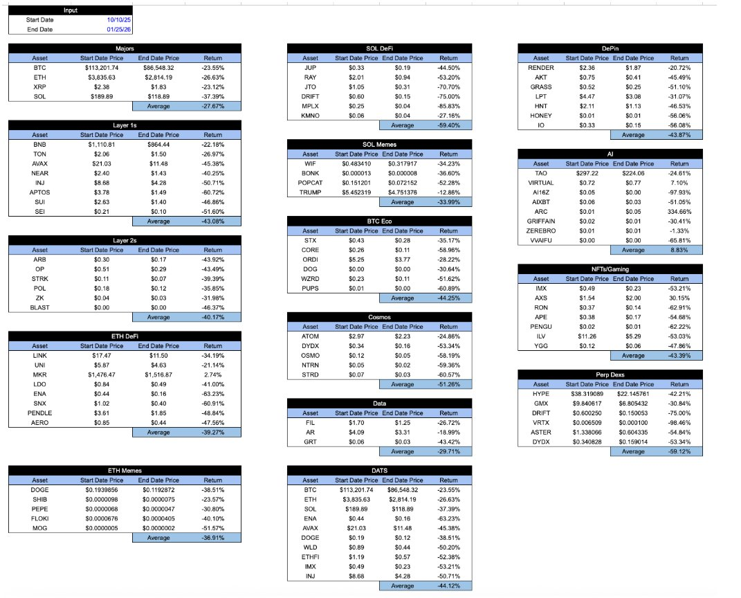 快进到今天,所有被「加密包装」的资产收益看起来都如出一辙。自 10 月 10 日闪崩以来,各板块的下跌幅度几乎无法区分。无论你持有的是什么,或者该代币如何捕获经济价值,亦或是该项目的发展轨迹如何……收益率大体上是一样的。这非常令人沮丧。