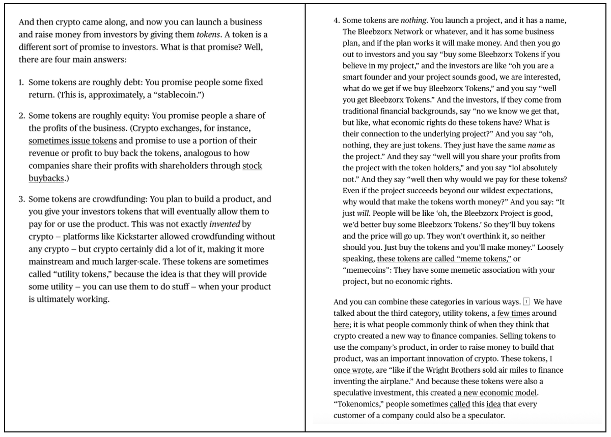 这就是为什么 Matt Levine 最近写的那篇关于代币的文章如此令人惊讶且受欢迎。仅用短短 4 个段落,Levine 就准确描述了各种代币之间的差异和细微差别。这给了我一些希望,说明这类分析依然可行。