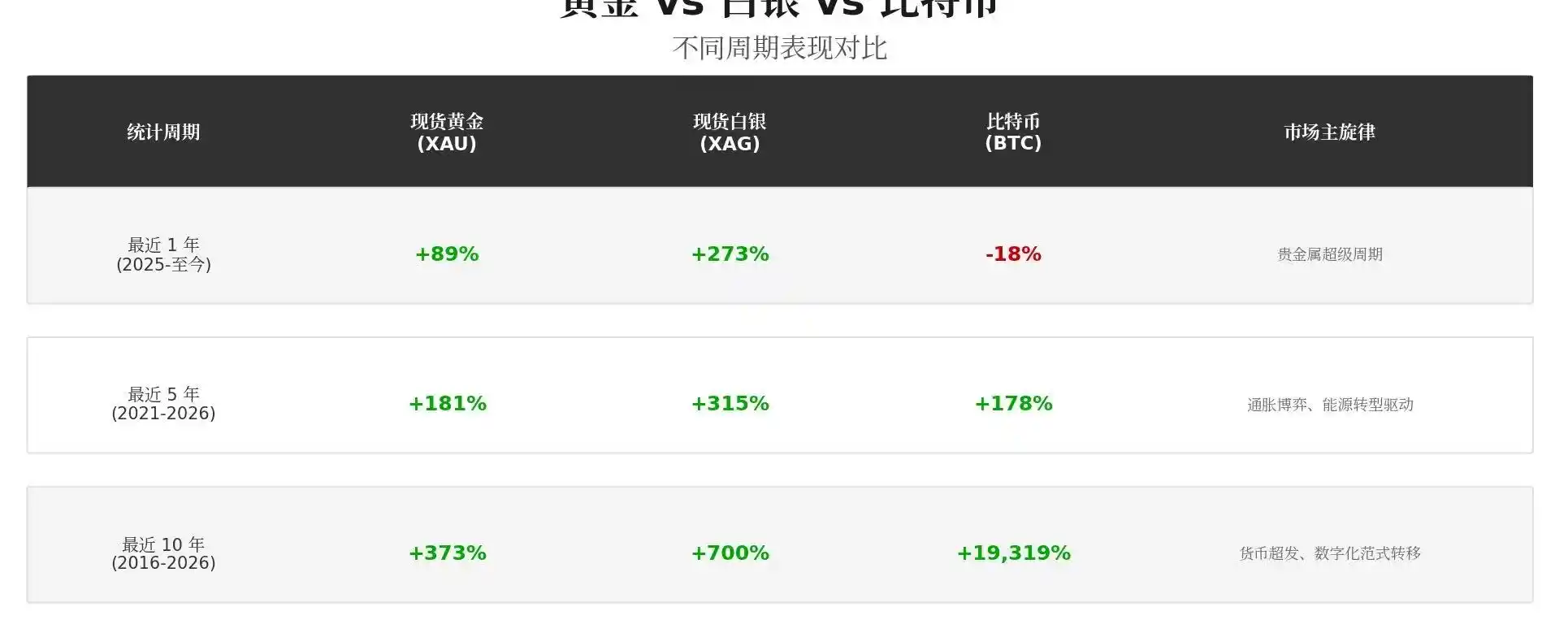 如果从长期视角看,比特币依然是回报最高的资产之一。但放到过去一年,比特币的表现却明显落后于黄金和白银。2025 年至 2026 年初的市场走势呈现出极为鲜明的二元分化特征,贵金属市场步入了一个被称为“超级周期”的阶段,而比特币略显颓势。下面是三个关键周期的对比数据: