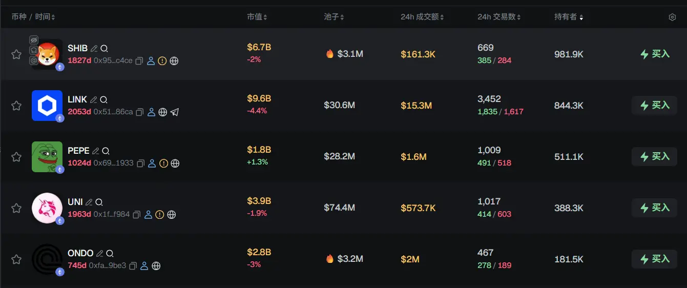 过去 24h ETH 热门代币前五依次为:SHIB、LINK、PEPE、UNI、ONDO