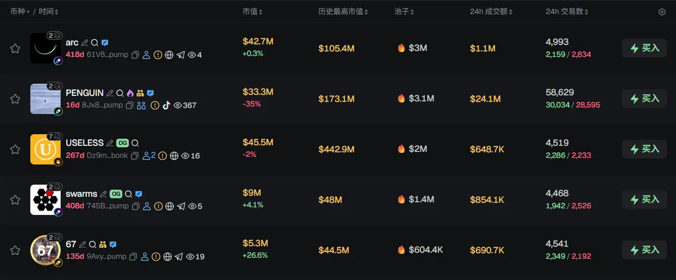 过去 24h Solana 热门代币前五依次为:arc、PENGUIN、USELESS、swarms、67