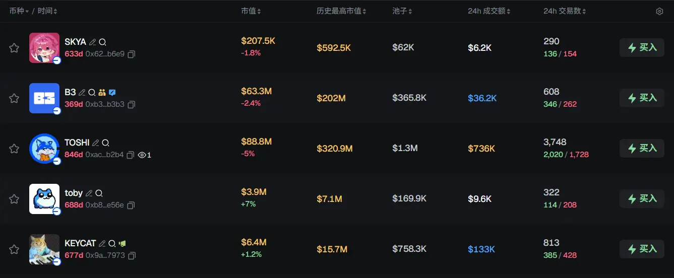 过去 24h Base 热门代币前五依次为:SKYA、B3、TOSHI、toby、KEYCAT