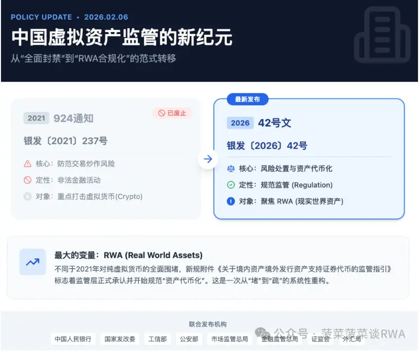 2021年的924通知通篇围绕虚拟货币,彼时"RWA"这个概念在国内监管语境中几乎不存在。但42号文用了大量篇幅专门界定和规范"现实世界资产代币化"(RWA),这本身就是一个巨大的信号——监管层正式承认了RWA作为一种业务形态的存在,并且决定为它划定游戏规则,而不是一刀切地否定。