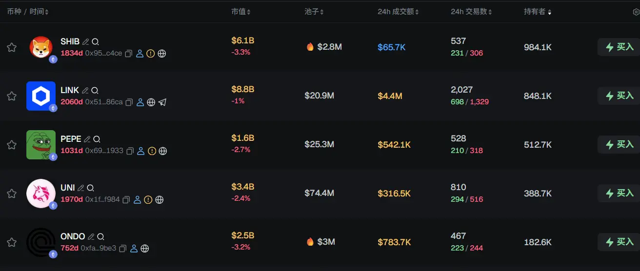 过去 24h ETH 热门代币前五依次为:SHIB、LINK、PEPE、UNI、ONDO