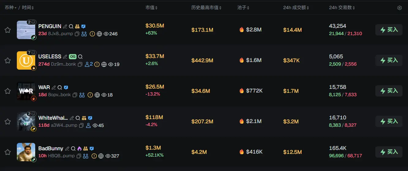 过去 24h Solana 热门代币前五依次为:PENGUIN、USELESS、WAR、WhiteWhale、BadBunny