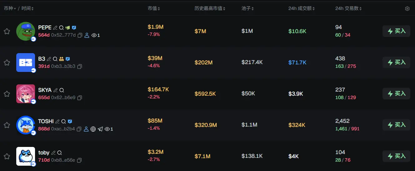 过去 24h Base 热门代币前五依次为:PEPE、B3、SKYA、TOSHI、toby