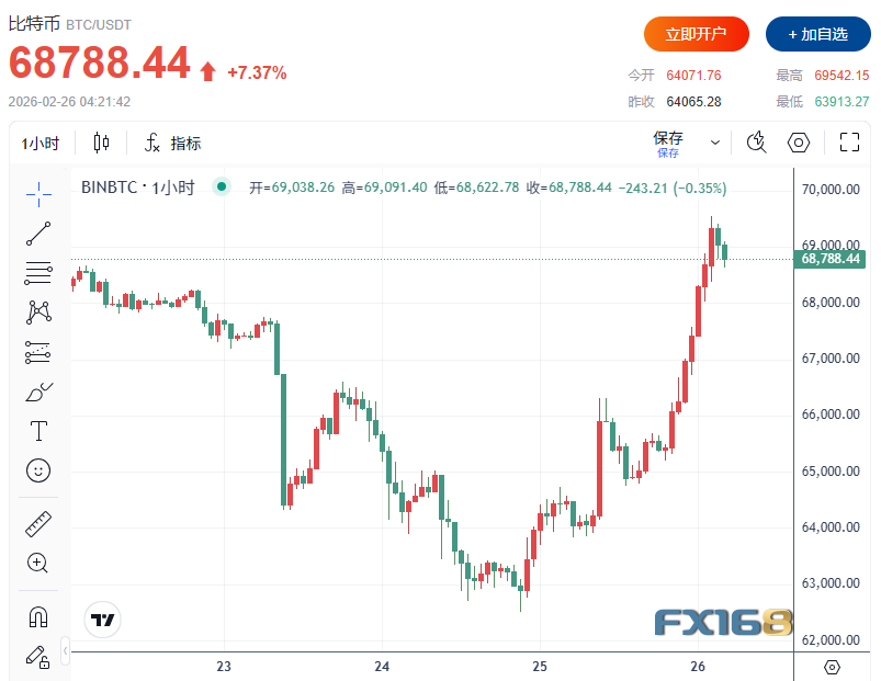 FX168财经报社(北美)讯 周三(2月25日),比特币逼近7万美元关口,终结连续三个交易日跌势。在美股小幅走高、整体风险情绪回暖以及英伟达财报发布前市场预期升温的背景下,加密资产出现明显修复性反弹。