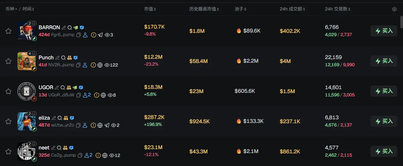 过去 24h Solana 热门代币前五依次为:BARRON、Punch、UGOR、eliza、neet