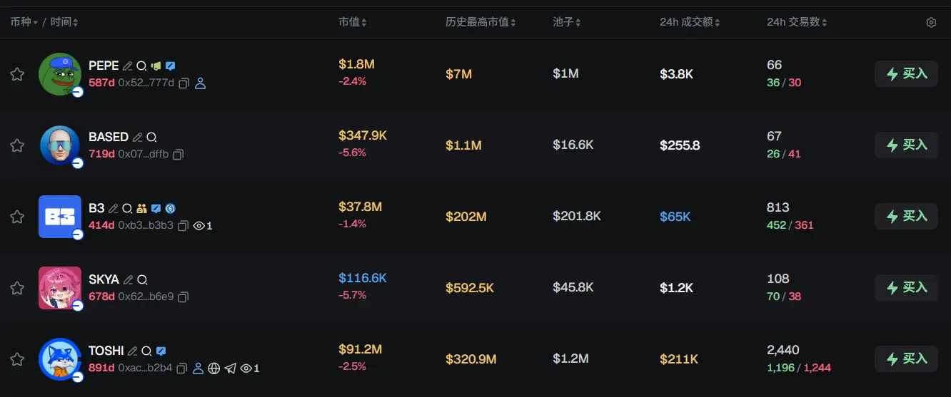 过去 24h Base 热门代币前五依次为:PEPE、BASED、B3、SKYA、TOSHI