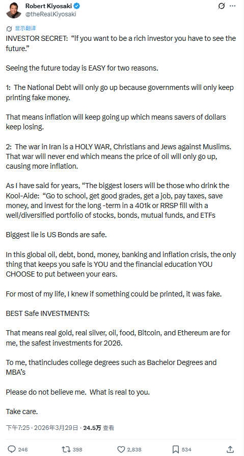 “在我人生的大部分时间里,我一直都知道,只要是能够被印出来的东西,它就是假的,”清崎在X上写道,“这意味着,对我来说,真正的黄金、真正的白银、石油、粮食、比特币和以太坊,才是2026年最安全的投资。”