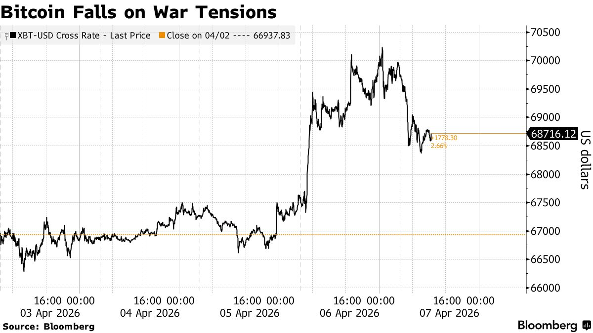 截至发稿,这一市值最大的加密货币一度下跌2.2%,报约68,800美元。此次下跌抹去了前一个交易日的涨幅;周一,比特币曾自3月以来首次短暂突破70,000美元。昨日,在Axios关于可能达成45天停火协议的报道推动下,比特币一度触及69,350美元,并短暂升破69,000美元。但这种乐观情绪只持续了大约12个小时。