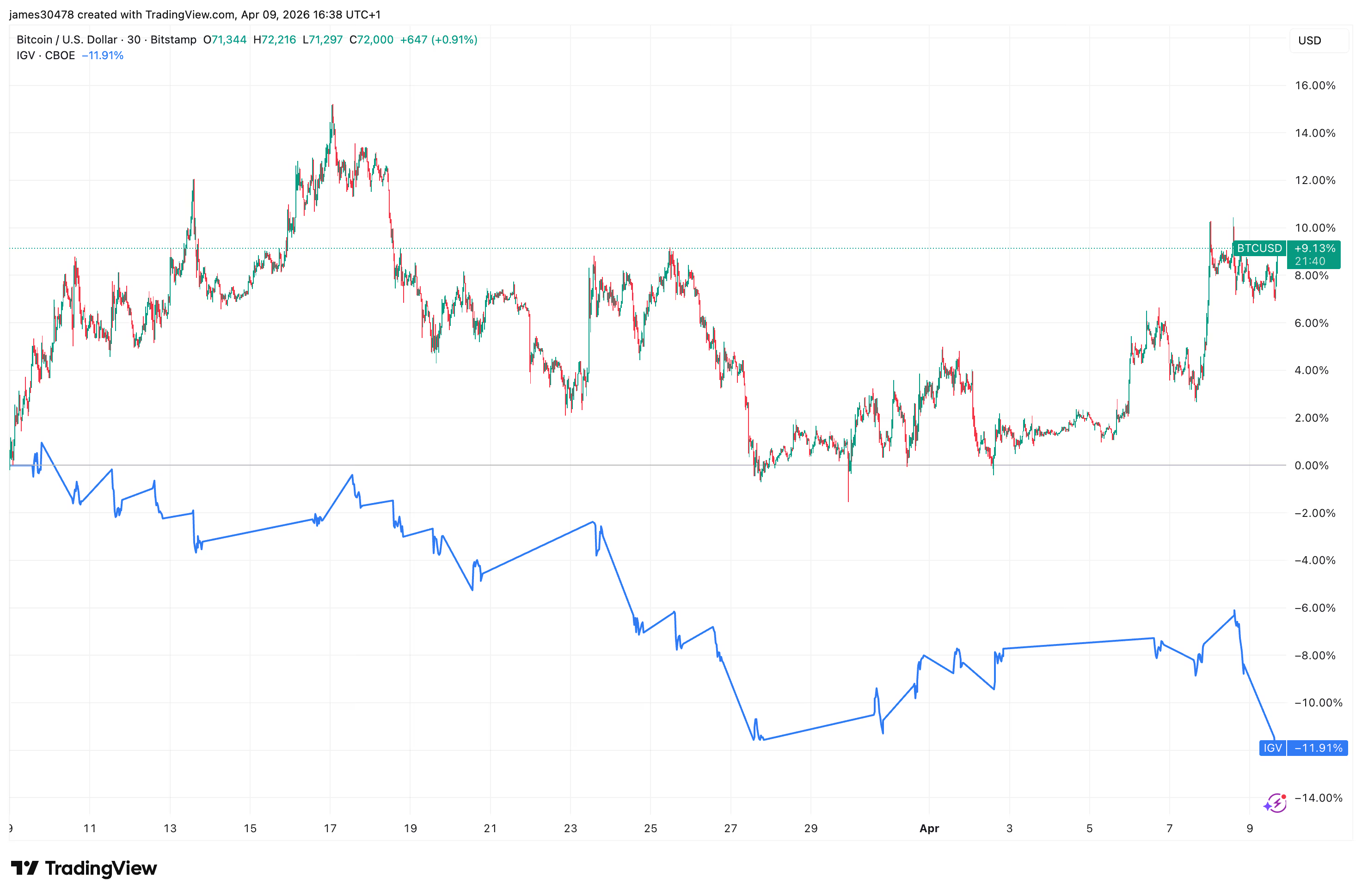 从过去一个月的表现来看,比特币累计上涨约9%,而IGV则下跌约12%,两者走势差异已经相当明显。