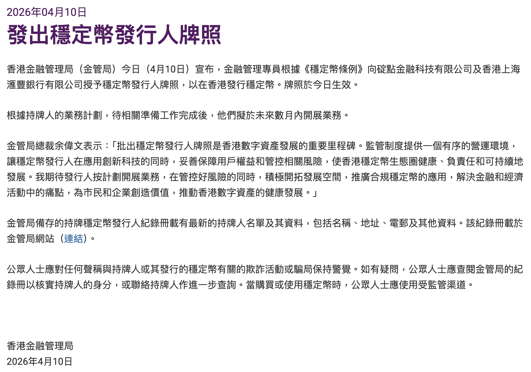 此次批准标志着《稳定币条例》(Stablecoins Ordinance)正式实施后的首批发牌结果。该条例已于2025年8月生效。