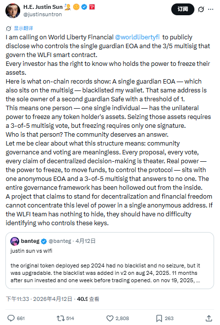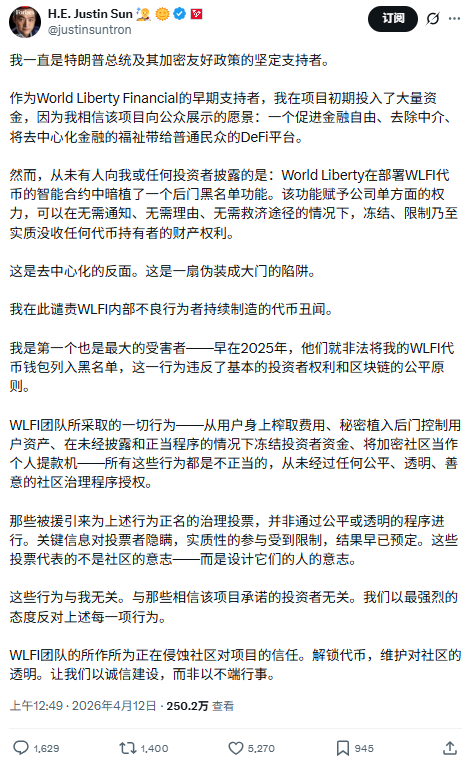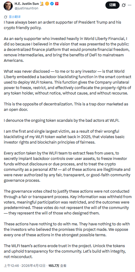 加密企业家孙宇晨(Justin Sun)周日(4月12日)在社交平台X上发文称,World Liberty在其区块链合约中加入了所谓的“黑名单后门功能”,不过他并未提供相关证据。
