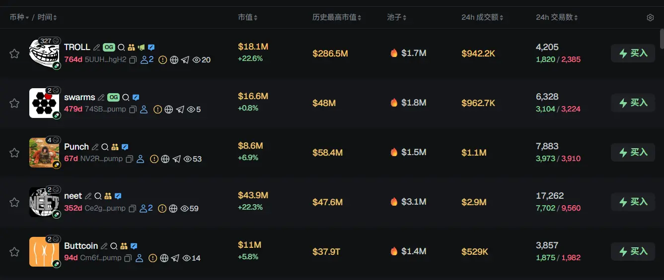 过去 24h Solana 热门代币前五依次为:TROLL、swarms、Punch、neet、Buttcoin