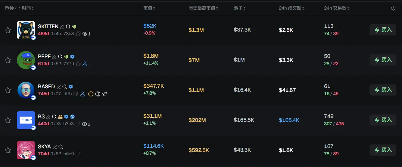过去 24h Base 热门代币前五依次为:SKITTEN、PEPE、BASED、B3、SKYA