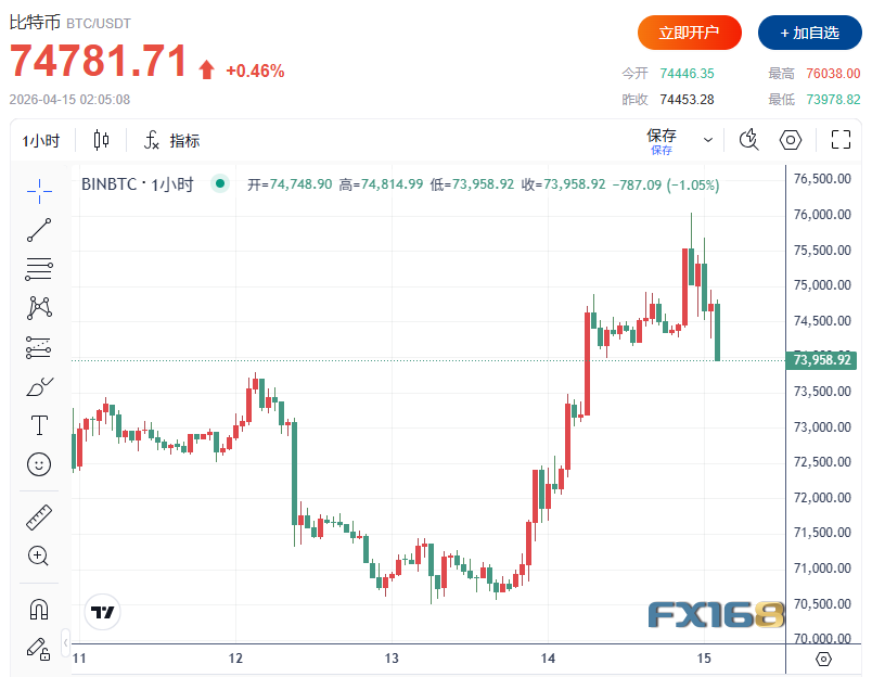 周二(4月14日),比特币强势上涨,一度攀升至76038.00美元高点,明显跑赢更广泛的市场反弹。市场普遍认为,这轮上涨并非由加密货币自身基本面突变推动,而是一次典型的宏观驱动型风险偏好修复。