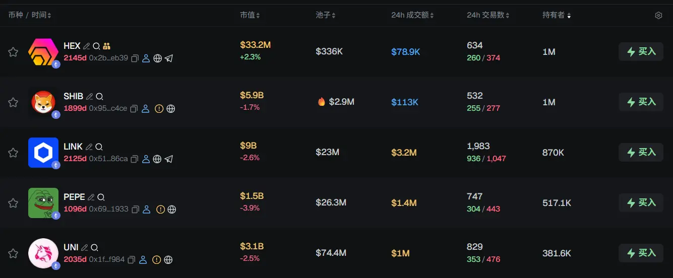 过去 24h ETH 热门代币前五依次为:HEX、SHIB、LINK、PEPE、UNI