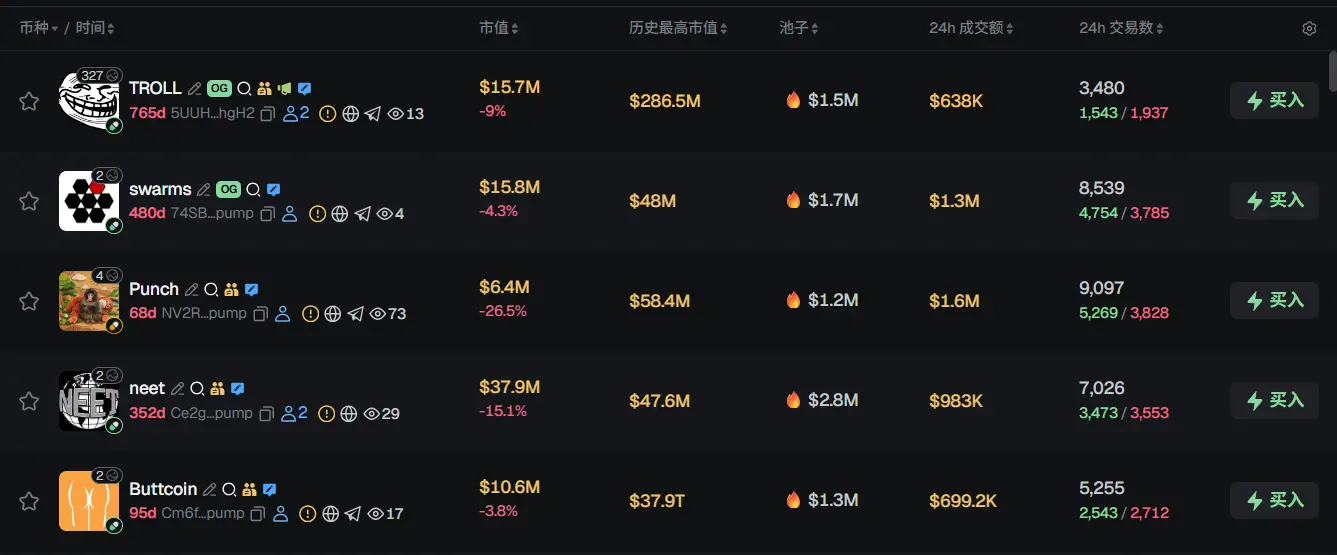 过去 24h Solana 热门代币前五依次为:TROLL、swarms、Punch、neet、Buttcoin