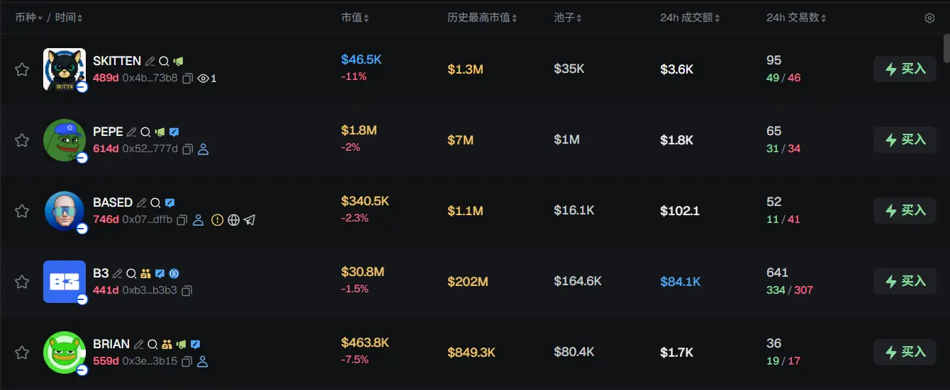 过去 24h Base 热门代币前五依次为:SKITTEN、PEPE、BASED、B3、BRIAN