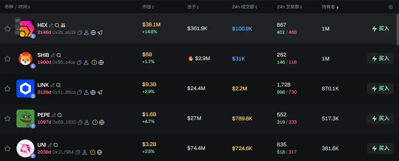 过去 24h ETH 热门代币前五依次为:HEX、SHIB、LINK、PEPE、UNI