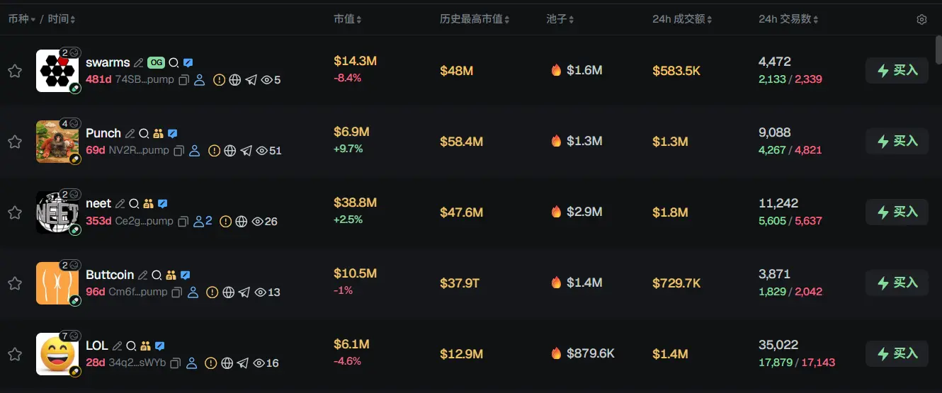 过去 24h Solana 热门代币前五依次为:swarms、Punch、neet、Buttcoin、LOL