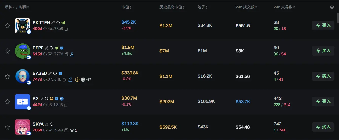 过去 24h Base 热门代币前五依次为:SKITTEN、PEPE、BASED、B3、SKYA