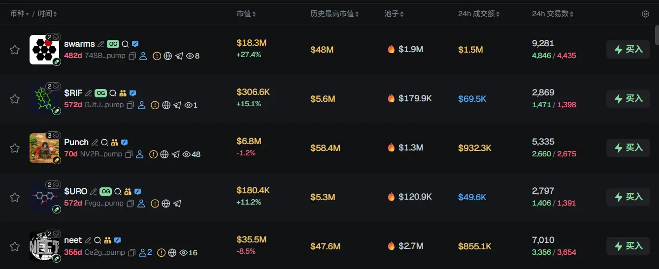 过去 24h Solana 热门代币前五依次为:swarms、$RIF、Punch、$URO、neet