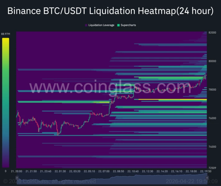 不过,若市场在当前局部高位出现获利了结,比特币也可能展开一轮相对健康的回调,重新下探77,500美元附近支撑。该区域目前已成为下一个重要的、由爆仓流动性支撑的价格带。