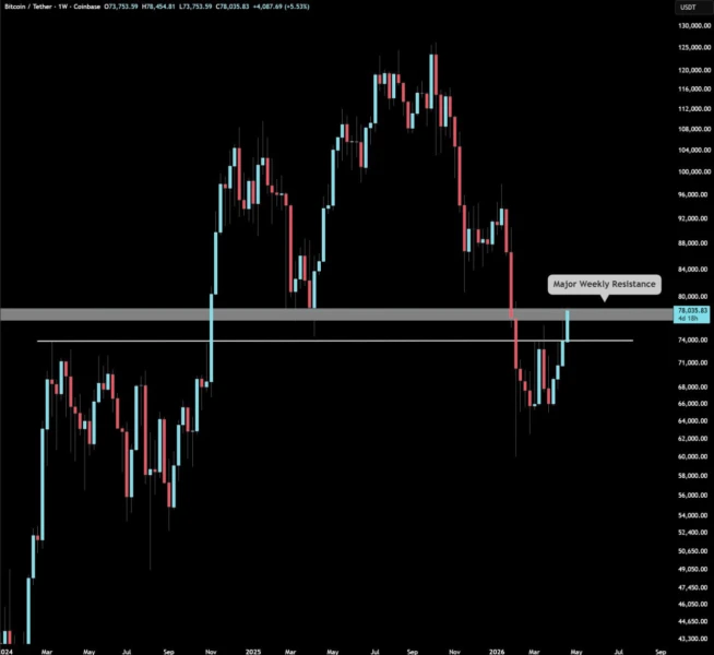 这一表态缓解了此前数周持续压制市场情绪的紧张局势。4月19日,在伊朗拒绝参加第二轮和平谈判后,比特币一度跌破74,000美元。此后,BTC持续反弹,累计涨幅超过7%,并在周三短暂突破79,000美元关口。