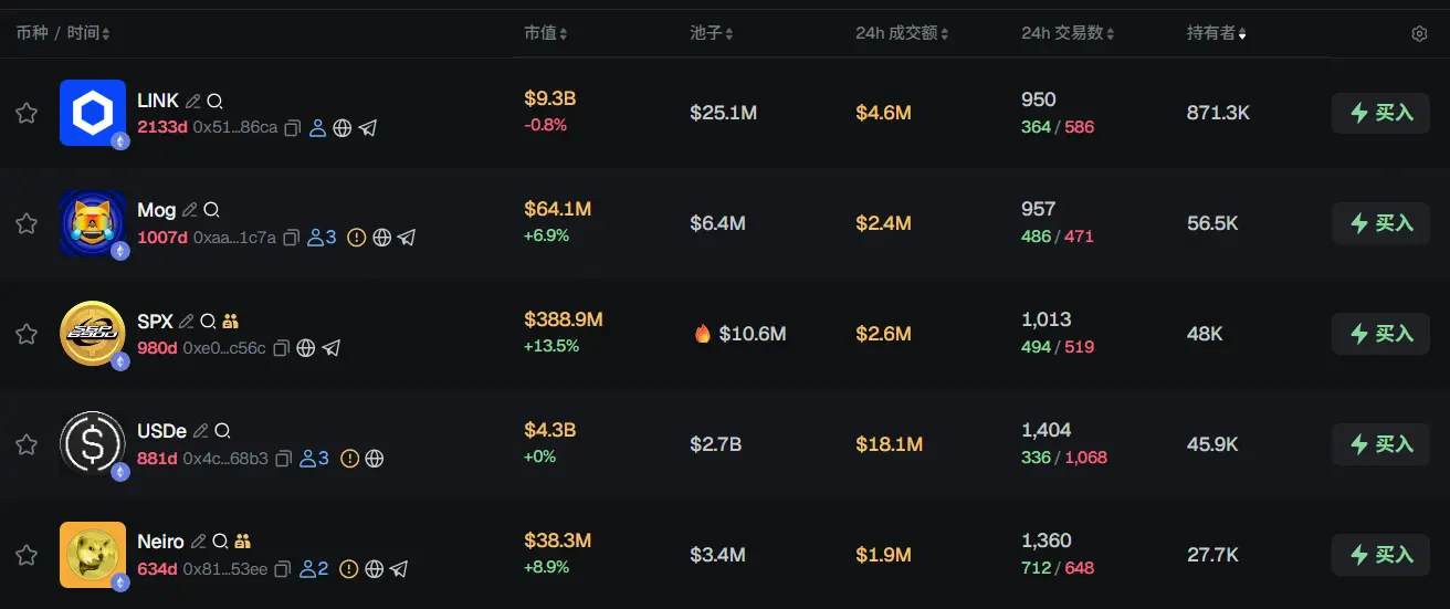 过去 24h ETH 热门代币前五依次为:LINK、Mog、SPX、USDe、Neiro