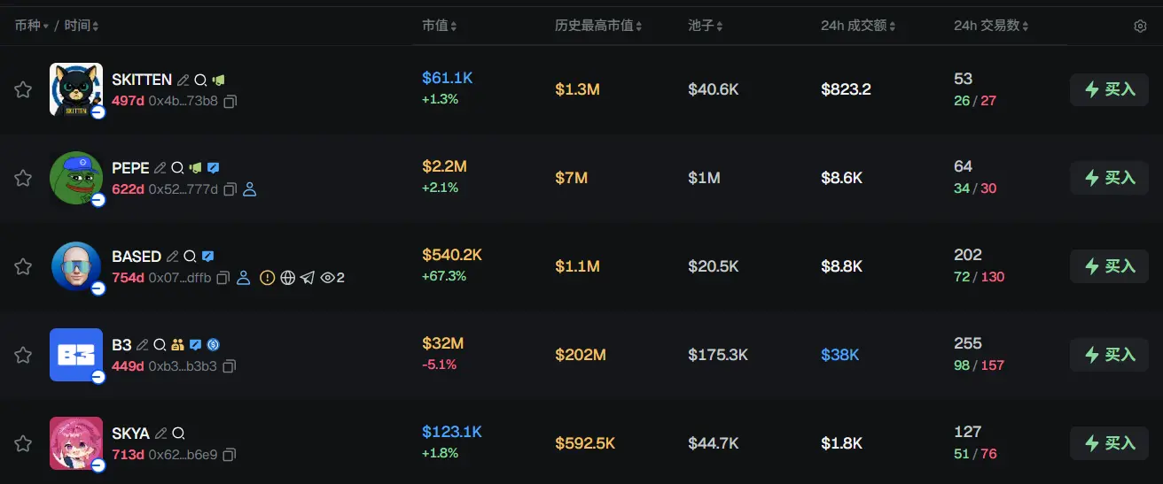 过去 24h Base 热门代币前五依次为:SKITTEN、PEPE、BASED、B3、SKYA