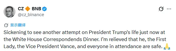ChainCatcher 消息,赵长鹏在 X 平台发文表示,“看到刚刚在白宫记者晚宴上再次出现针对总统特朗普的袭击企图,真令人作呕。所幸他、第一夫人、副总统万斯以及所有在场人员都平安无事。”