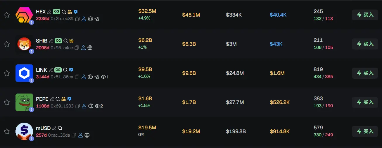 过去 24h ETH 热门代币前五依次为:HEX、SHIB、LINK、PEPE、mUSD