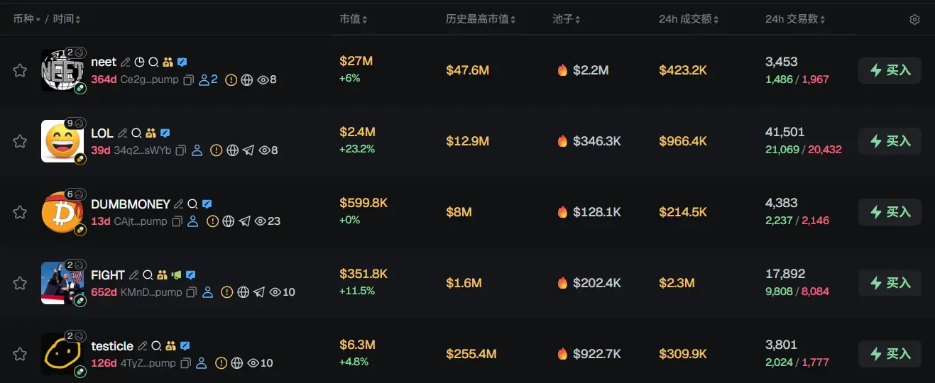过去 24h Solana 热门代币前五依次为:neet、LOL、DUMBMONEY、FIGHT、testicle