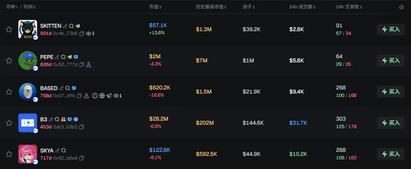 过去 24h Base 热门代币前五依次为:SKITTEN、PEPE、BASED、B3、SKYA