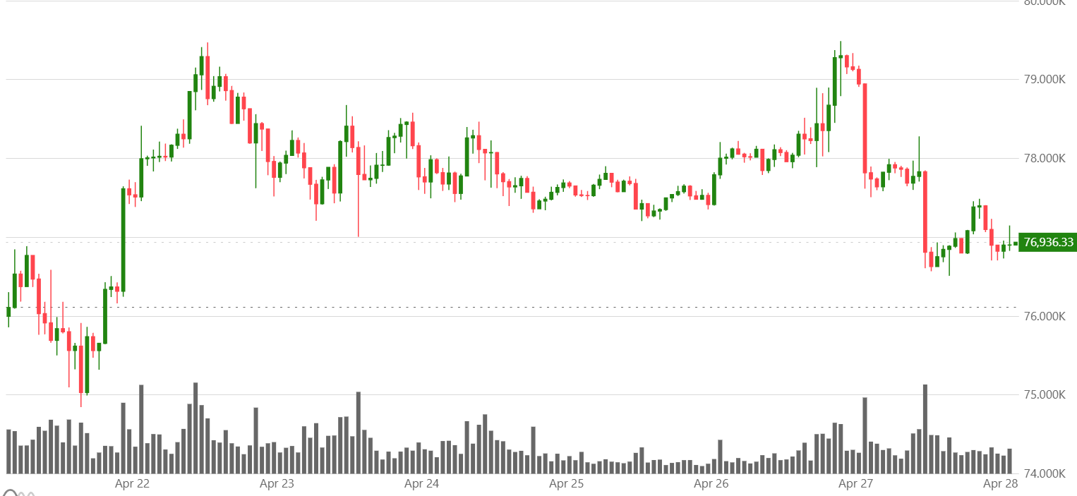 FX168财经报社(亚太)讯 周二(4月28日)比特币在亚洲早盘交易中下跌3%,徘徊在77,000美元附近。随着市场迎来一周密集的宏观催化因素,本轮回落看起来更多是由谨慎情绪驱动,而非市场情绪发生根本转向。