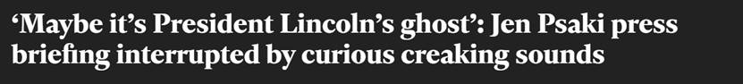当地时间4月27日,白宫新闻秘书普萨基讲话时被吱吱声打断,她开玩笑说是美国第16任总统林肯的鬼魂。
