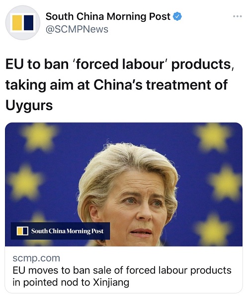 冯德莱恩在欧洲议会发表年度欧盟国情咨文时所做这项宣布。冯德莱恩表示,为了确保被威胁或强迫劳动的人生产的产品不会“最终在欧洲的商店里出售……我们将提议在我们的市场上禁止被强迫劳动生产的产品”。