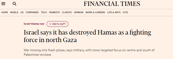 FX168财经报社(香港)讯 英国《金融时报》周一(1月8日)报道称,以色列军方表示,已成功摧毁哈马斯在加沙北部的有组织战斗力量,并已将重点转移到这片遭受重创的地区的中部和南部,这是以色列与巴勒斯坦激进组织哈马斯战争进入的新阶段。