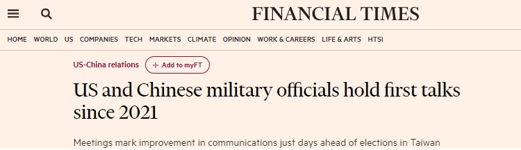 FX168财经报社(香港)讯 英国《金融时报》周三(1月10日)报道称,美国和中国军方官员举行了两年多来的首次正式会谈,以落实美国总统拜登(Joe Biden)和中国国家主席习近平去年11月达成的一项协议。