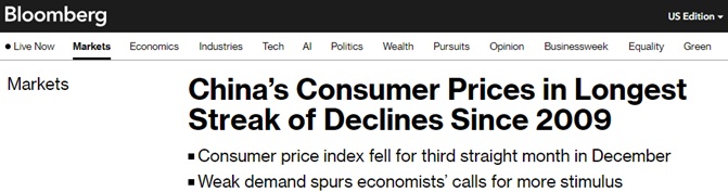 彭博社称,世界第二大经济体中国一直在与通货紧缩作斗争,部分原因是房地产持续低迷、消费者信心低下和出口疲软等因素。
