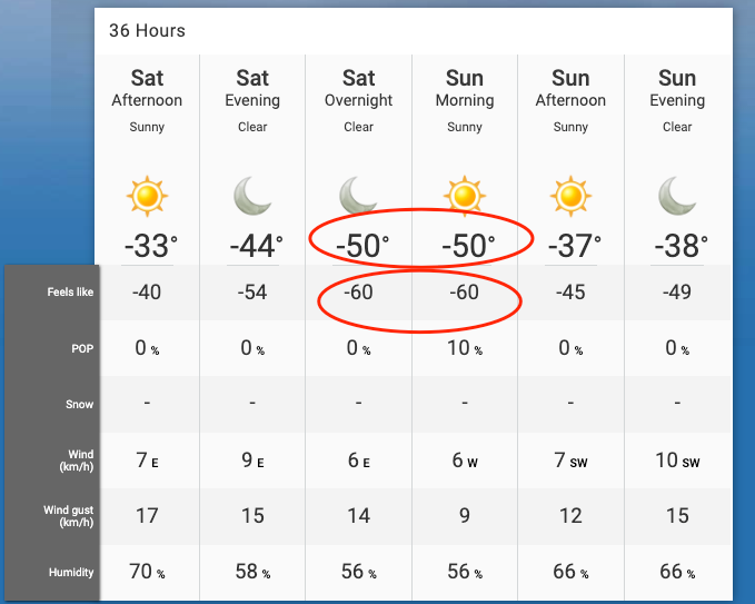 一月份,极地涡旋给阿尔伯塔省全省带来了 -40 摄氏度的气温,省会埃德蒙顿体感温度一度跌至 -60 摄氏度。