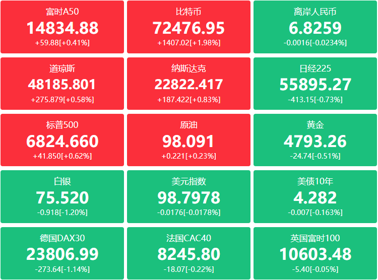 FX168财经报社(北美)讯 美股周四(4月9日)延续涨势,尽管国际油价同步走高,但交易员依然对美国与伊朗之间这项脆弱的两周停火安排能够维持抱持乐观预期。标普500指数上涨0.62%,收于6824.66点;纳斯达克综合指数上涨0.83%,报22822.42点;道琼斯工业平均指数上涨275.88点,涨幅0.58%,收...