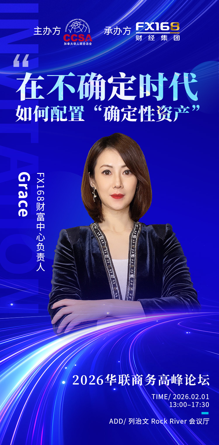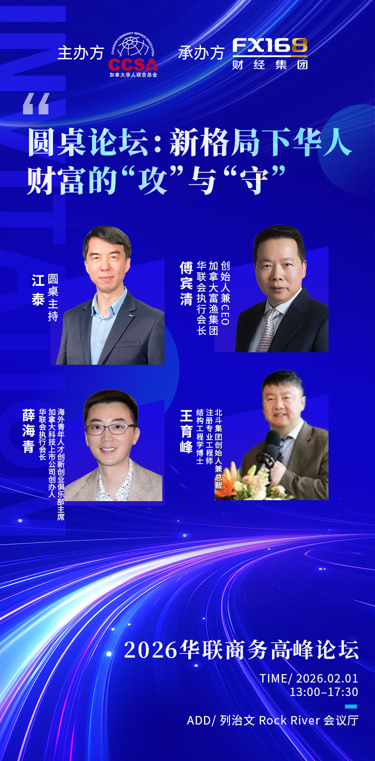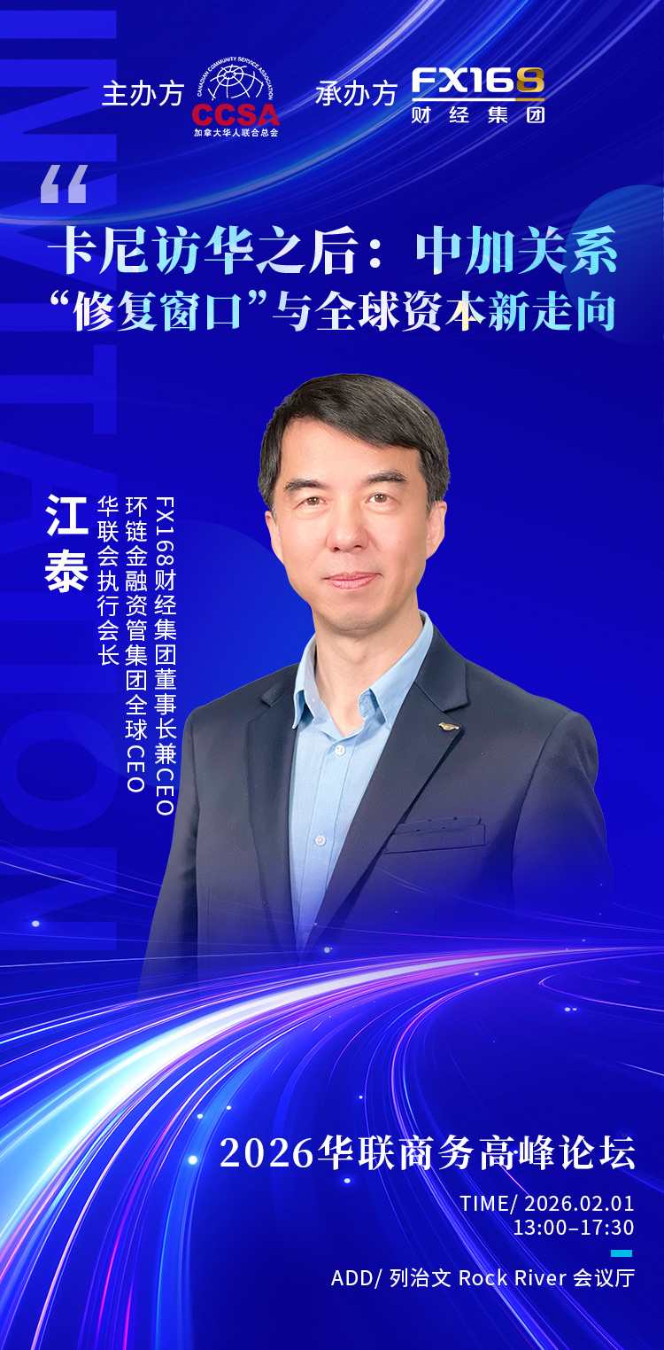在全球政治、经济与金融格局持续重塑的背景下,加中关系与华人财富走向再次成为市场高度关注的焦点。2026年2月1日(周日),由加拿大华人联合总会主办、FX168财经集团承办的“2026华联商务高峰论坛”将在加拿大列治文河石娱乐度假酒店(River Rock)Fraser会议厅隆重举行。本届论坛以“全球变局下的财富策略——从'卡尼总理访华'看加中关系、资本走向与华人机会”为主题,围绕国际格局演变、加中关系修复、资本流向与华人机遇展开深入探讨。